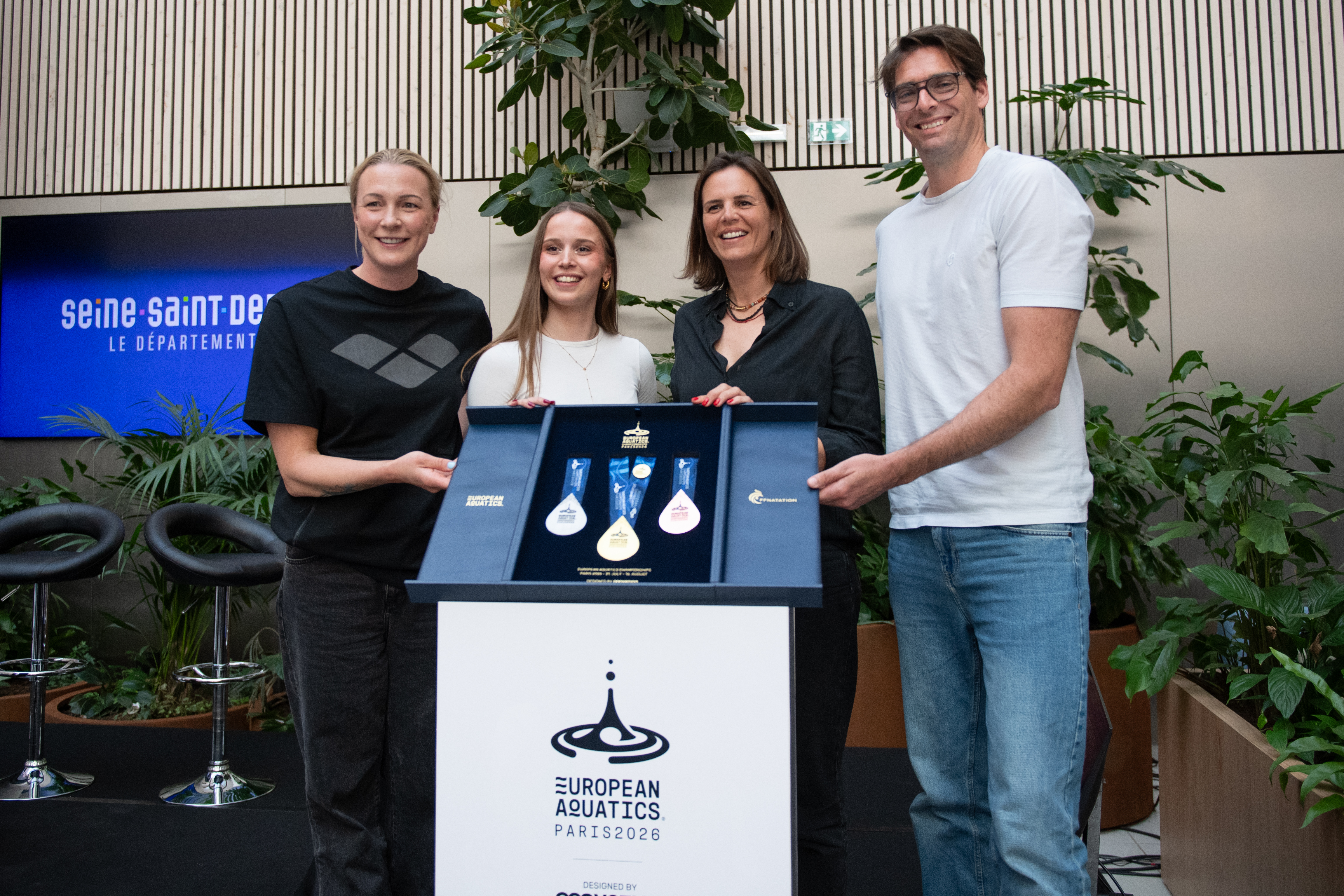 Jeudi 16 avril, le bâtiment Pulse, siège du département de la Seine Saint Denis a accueilli une conférence de presse exceptionnelle à 100 jours du début des championnats d'Europe de Paris. Romane Lunel, Laure Manaudou, Sarah Sjöström et Camille Lacourt ont répondu présent à l'invitation pour évoquer cet événement qui se tiendra du 31 juillet au 16 août 2026 à Paris et Saint-Denis.