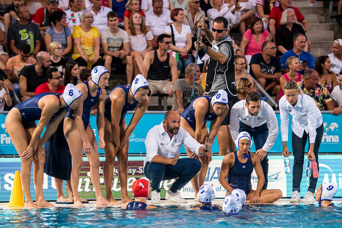Les joueuses de l'équipe de France écoutent les consignes de Florian Bruzzo lors des championnats du monde de Budapest (DeepBlueMedia).