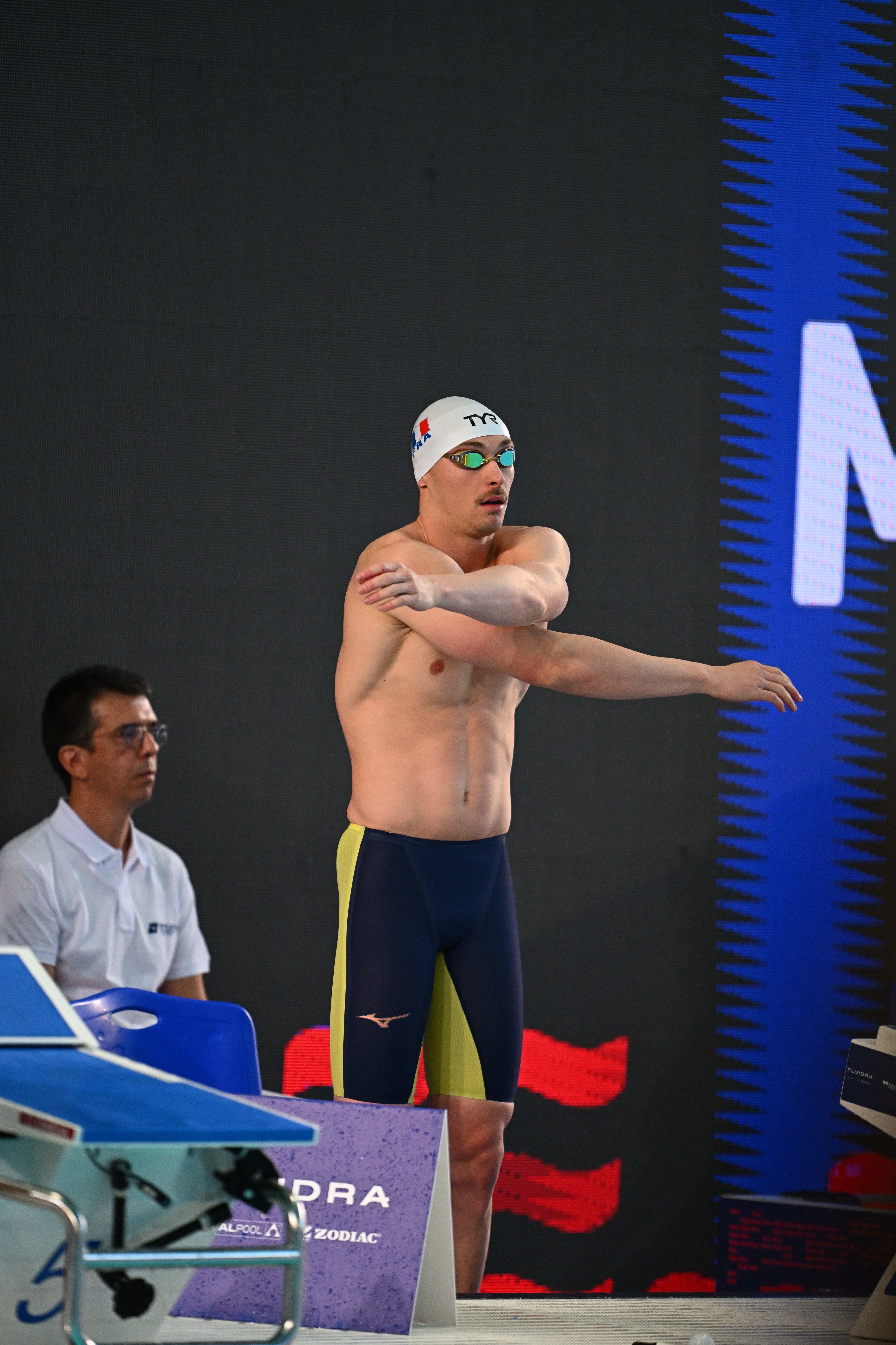 "En gestion, oui. Je ne me suis pas plus employé que ça mais c'était très bien pour ce matin. Il y a aussi le fait de ne pas se faire écarter par mes compatriotes, mes camarades. Je ne voulais pas être dans le cas de figure, il fallait assurer et c'est ce que j'ai fait donc c'est très bien. Le 100 m 4 nages va être drôle. Ça va être très drôle. On a chacun nos points forts, on va s'appuyer dessus. J'ai fait une reprise de nage où je sors la main de l'eau au premier coup de bras, mais je fais une très bonne brasse, 14"6 c'est pas mal. En crawl, je ne sais pas ce qu'il (Noè Ponti) a fait, mais je pense qu'il a fait tout moyen, alors que j'ai ralenti le crawl, donc ça va être une belle bagarre. On n'attend rien dans le sens où on prépare rien. Je ne fais pas de brasse ni de dos à l'entraînement, donc c'est pour le fun."
