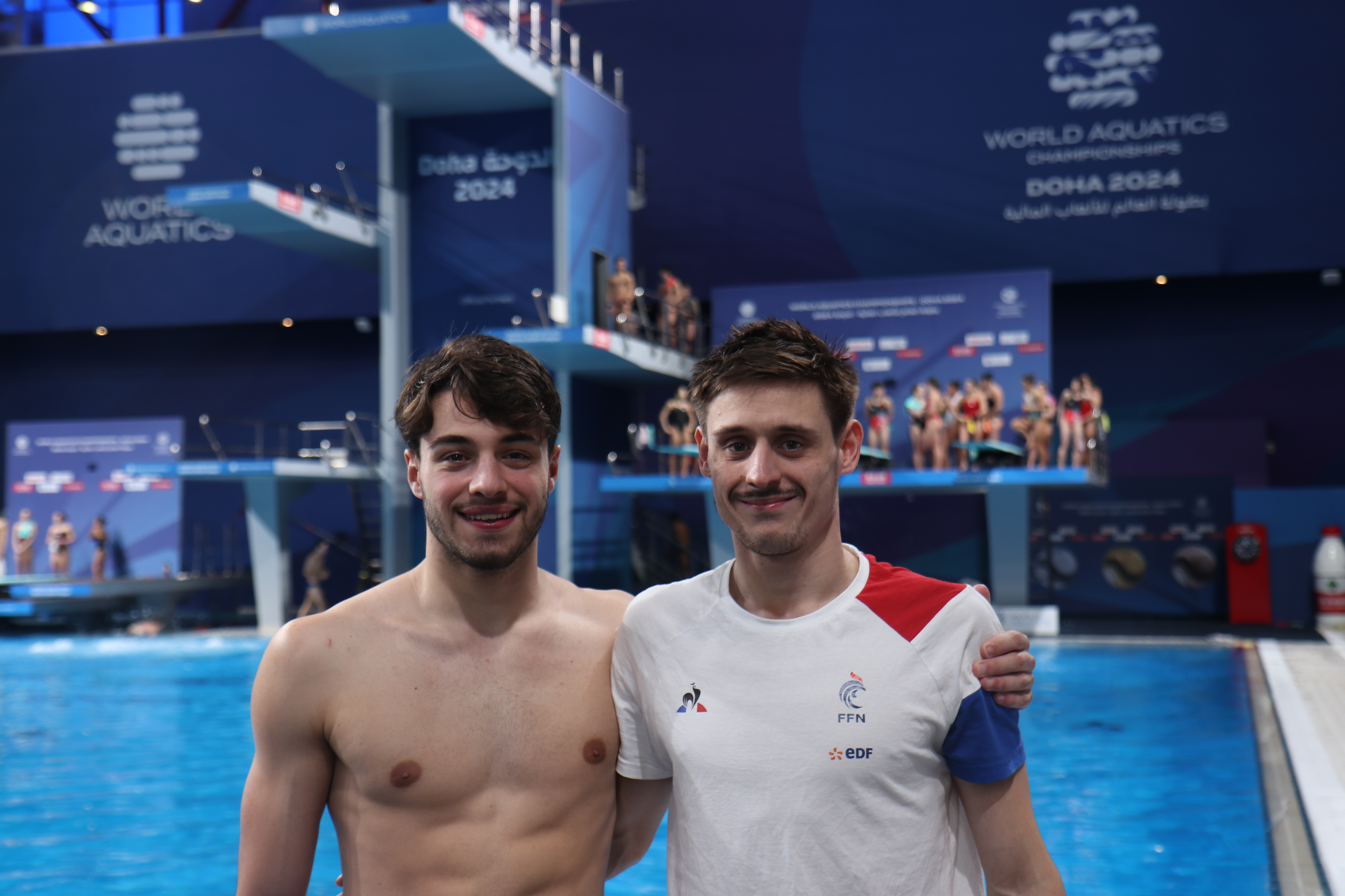 Voilà deux noms de plus de connus pour les Jeux olympiques de Paris 2024. En plongeon, Jules Bouyer et Gwendal Bisch s'ajoutent à la liste des qualifiés pour représenter leur pays à domicile l'été prochain. Sur tremplin à 3 m, les deux jeunes hommes ont assuré une place en finale, synonyme de quota nominatif pour l'épreuve qui aura lieu dans le Centre aquatique olympique. Une véritable bouffée d'oxygène et un grand moment d'émotions pour les deux protégés de Clémence Monnery et Maissam Naji.